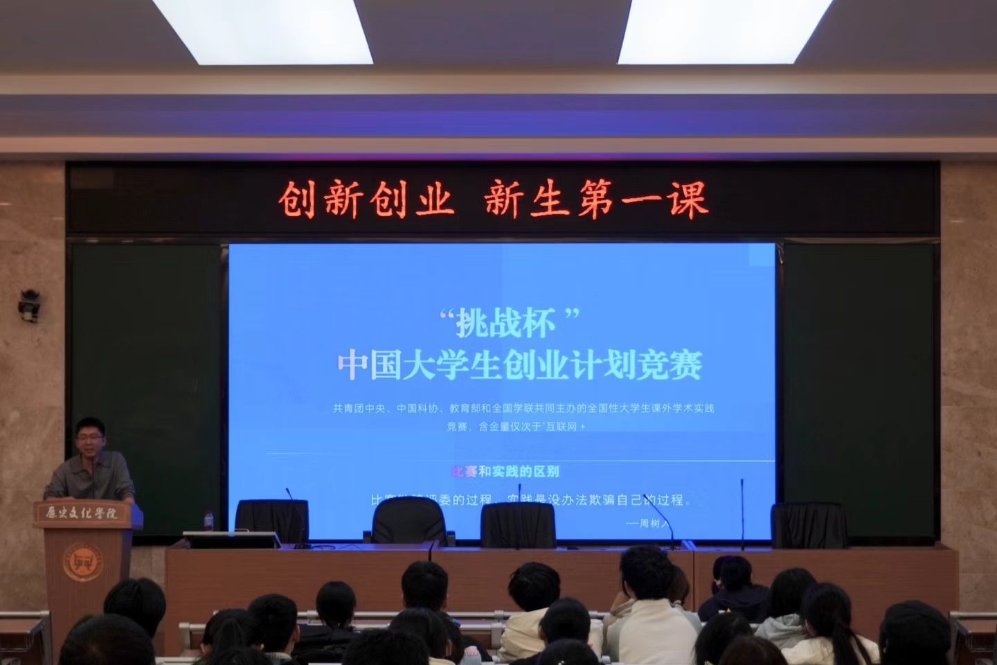 (通讯员 杜玲瑶 龙思贝)11月14日下午,金沙2004路线js5于文渊楼203学术报告厅召开“创新创业 新生第一课”讲座。创新创业学院校友、黑马日语的创始人胡含兵、创新创业学院何文君和学工办主任陈敏、2025级辅导员胡思琦出席此次会议,部分2024级和2025级学生参加此次会议,讲座由2025级年级长解硕同学主持。