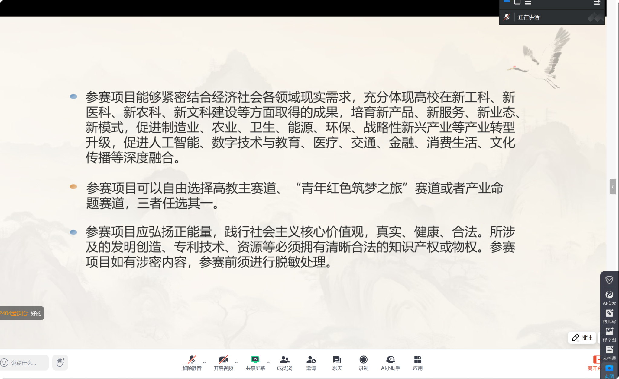 (通讯员 李采宸 游子萱)2月28日下午,金沙2004路线js5团委青创部于腾讯会议举办中国国际大学生创新大赛宣讲会。此次宣讲会由历文院副教授刘潆檑主讲,院团委书记陈卓君参加,2022、2023级部分学生、2024级全体学生参加。