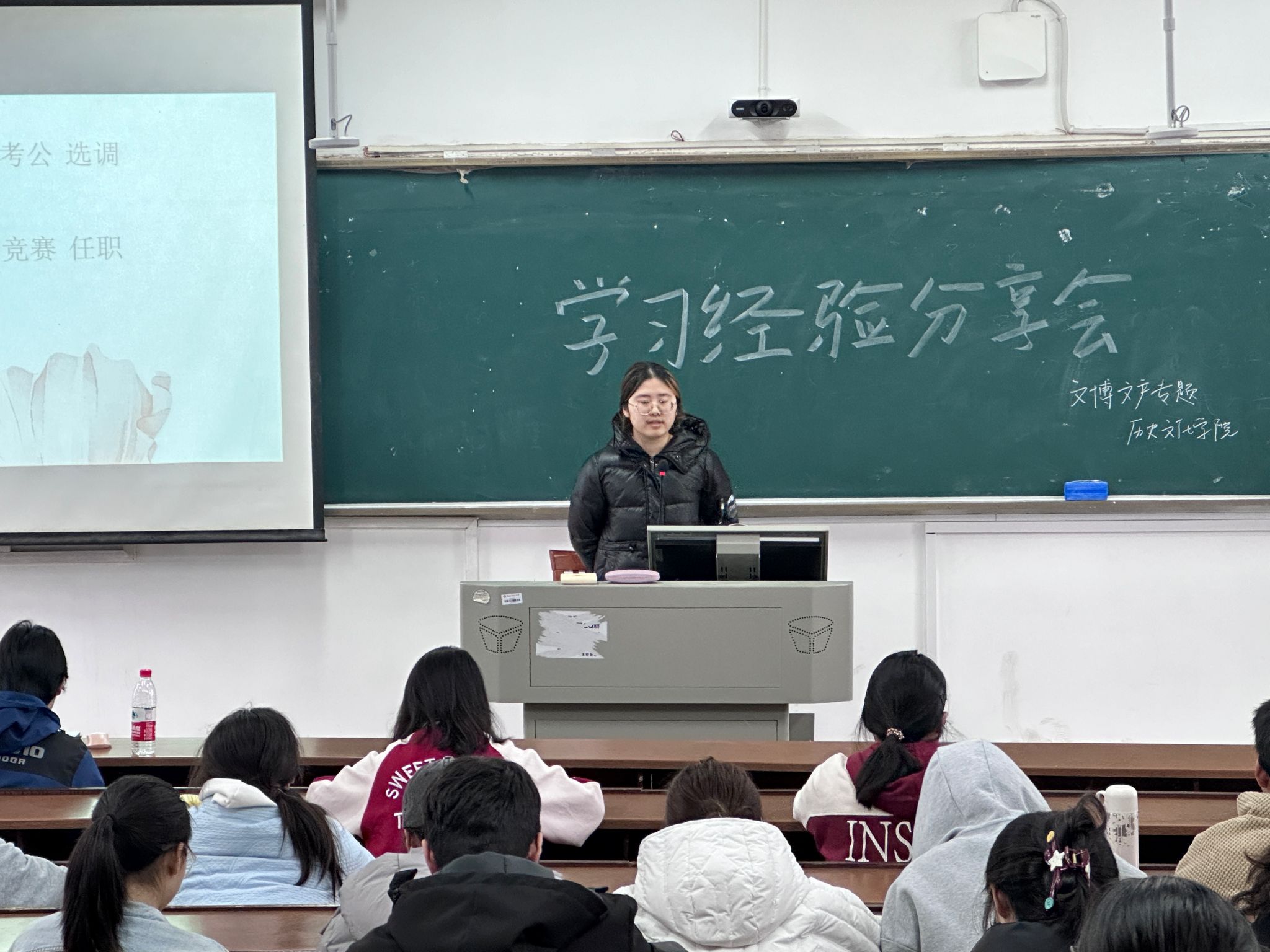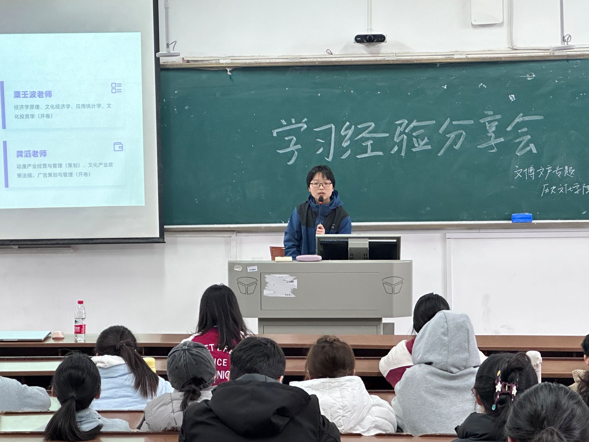 分享会上,徐妹围绕“课程学习”,对文物产业管理专业的学习路径进行了系统解析。她从授课教师的不同特点出发,分析了各门课程平时作业与期末考试的要求,并分享了自己的见解,提及大学生活不应仅聚焦于绩点提升,还可通过尝试新事物、参与各类活动拓宽视野,丰富个人经历。娄思米则针对“现阶段如何选择”这一话题,从考研、考公、选调、竞赛等多个维度展开介绍,并给出了贴合实际的建议。在互动环节,新生们就“就业方向”“学业与生活平衡”等问题踊跃提问,徐妹和娄思米结合自身经历进行耐心解答。