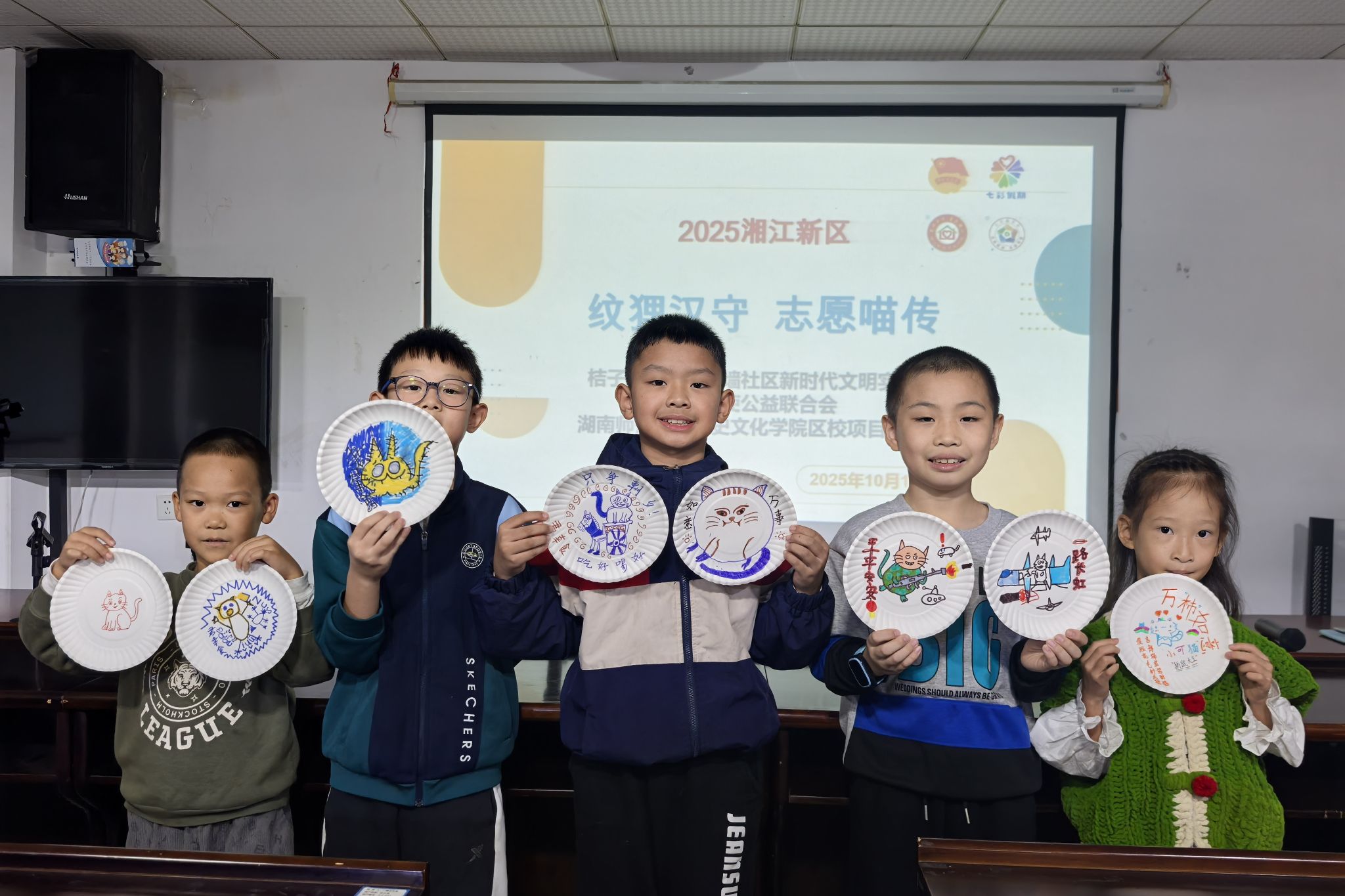 活动伊始,志愿者代表向小朋友们讲解了由“狸”到“猫”的名称演变,并结合视频引入了“狸猫纹”文化。随后,志愿者结合图文,介绍了汉代文物"狸猫纹漆食盘"的纹饰特点与文字内容,展示该纹饰在当时的具体运用。在互动环节,志愿者代表通过课堂问答引导小朋友们思考狸猫纹在古代生活中的实用功能与文化内涵,进而阐释该纹饰所蕴含的祥瑞寓意、生死观与自然生态观。手工环节中,小朋友们在志愿者的帮助下利用彩笔在纸盘描摹狸猫纹和添加诗句,制作出各具特色的“守护盘”。制作完成后,小朋友们依次上台展示作品,并分享创作理念。活动结束后,志愿者们清扫活动现场,并合影留念。
