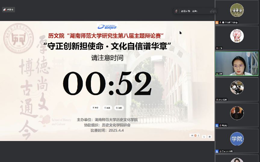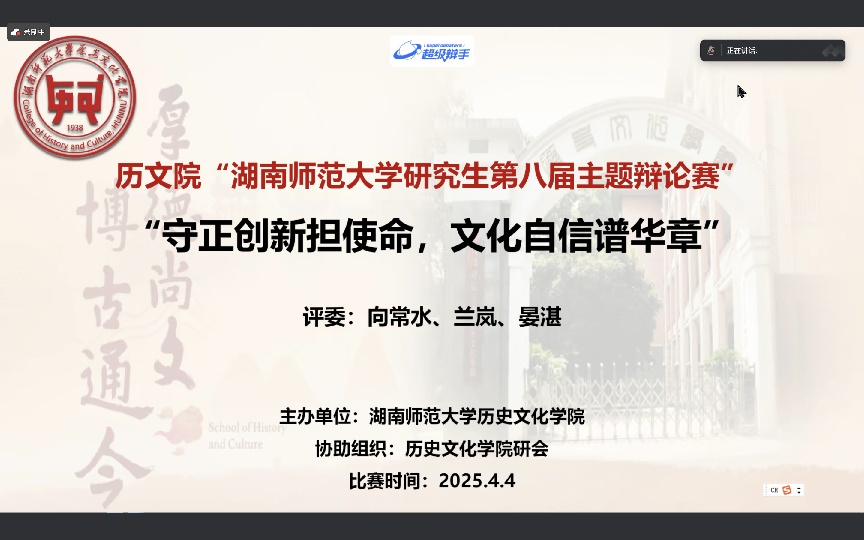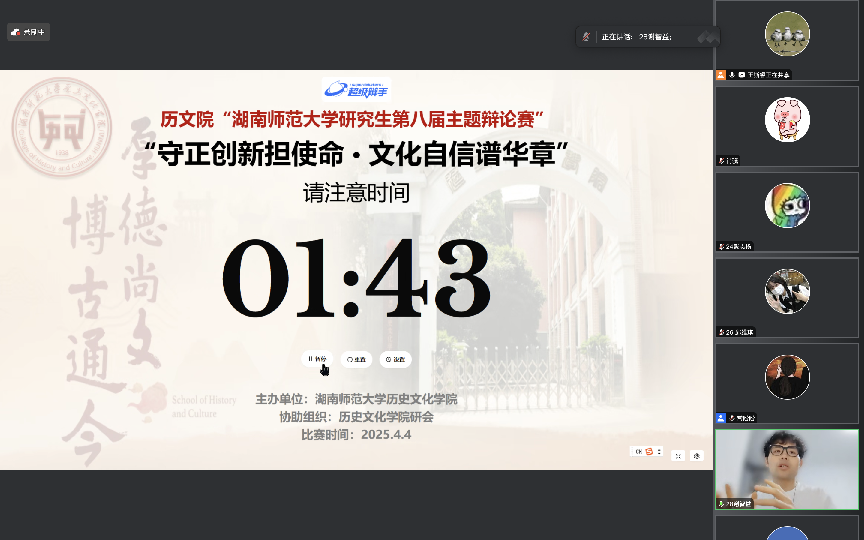(通讯员肖骁)2025年4月4日晚7:00,金沙2004路线js5为选拔优秀辩手参加校级辩论赛事,通过腾讯会议平台,成功举办了第八届主题辩论赛线上选拔活动。本次活动吸引了学院33名研究生同学积极参与,围绕着社会热点议题展开思维碰撞,充分展现了金沙官网学子的思辨风采。