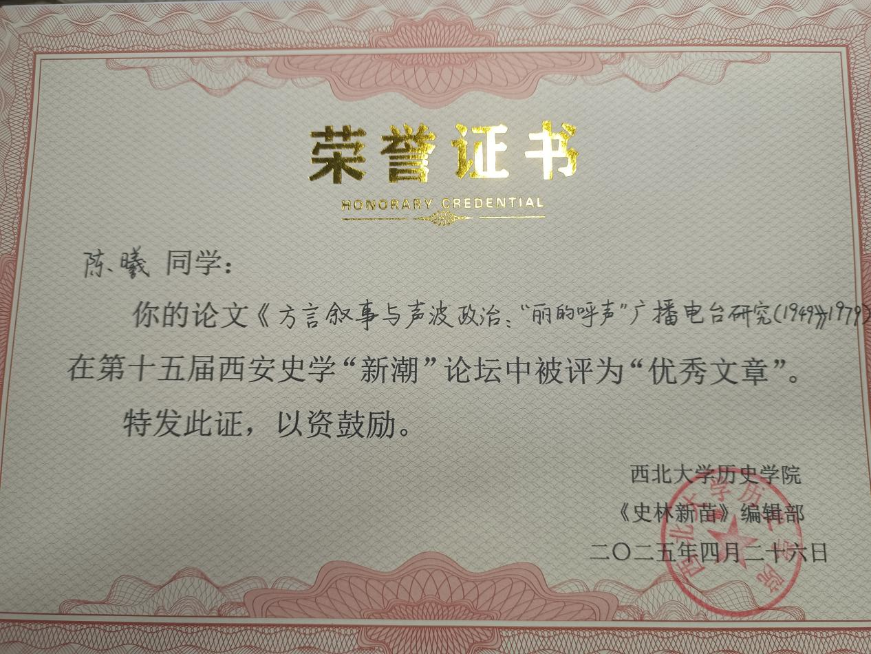 2025年4月26日至27日,金沙官网2021级本科生陈曦、2022级本科生马天律应邀赴西北大学长安校区参加“第十五届西安史学‘新潮’论坛”。西安史学“新潮”论坛是由西北大学历史学院《史林新苗》编辑部和陕西师范大学金沙2004路线js5《唐潮》编辑部合办的、面向全国各高校历史学及相关专业本科生的学术交流活动,自创办以来已连续举办十五届。据悉,本届论坛投稿数量创历史新高,共收到来自全国109所高校的604篇稿件,经国内多所高校专业教师严格评审、严格筛选,来自清华大学、复旦大学、南京大学、浙江大学等高校的70篇学术论文和12篇札记入选论坛,经现场汇报、专家评议,最终评选16篇“优秀文章”。陈曦同学和马天律同学向论坛分别提交了题名为《“丽的呼声”广播电台研究(1949-1979)》与《清末京师万牲园之嬗变与新政的公共宣传》的学术论文并做报告,得到点评专家的高度肯定,并提出了宝贵的修改意见,陈曦同学的论文获得“优秀文章”荣誉。