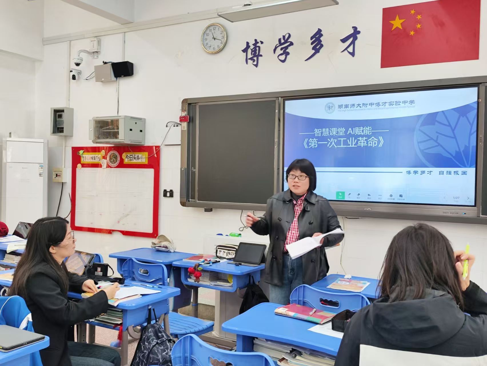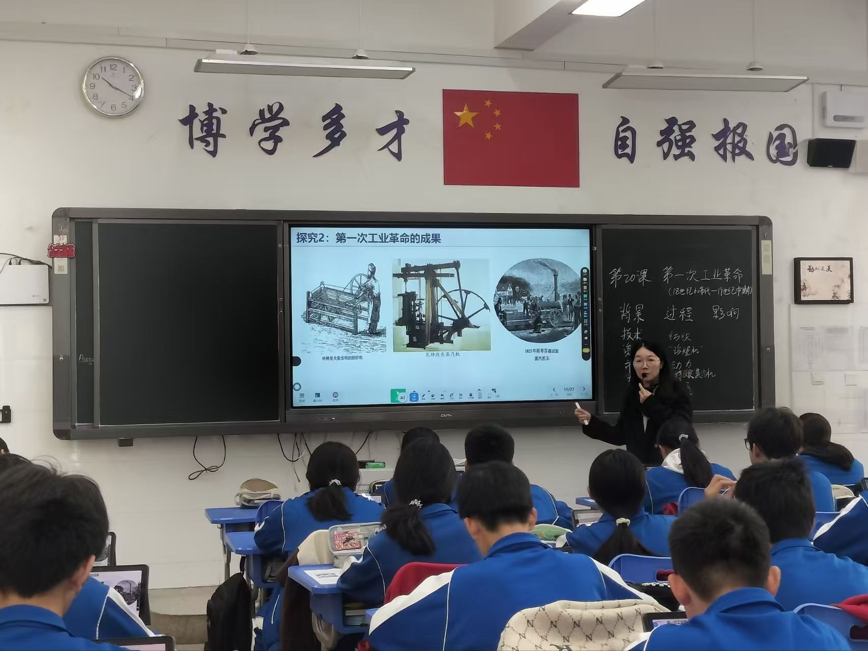 开放日展示了两节各具特色的历史公开课。八年级刘姗老师执教的《辛亥革命——破晓与迷雾》以“路”为主线,重新组织教材内容,通过“开路·筑路·迷路”的递进结构,层层剖析辛亥革命的背景、进程与历史困境,体现了对历史逻辑与教材内容的深度挖掘。九年级刘念老师则在《智慧课堂AI赋能——第一次工业革命》中,借助生成式历史情境图片、数字人对话互动、动态图示解析等数字工具,构建了沉浸式、高互动的智慧学习环境。