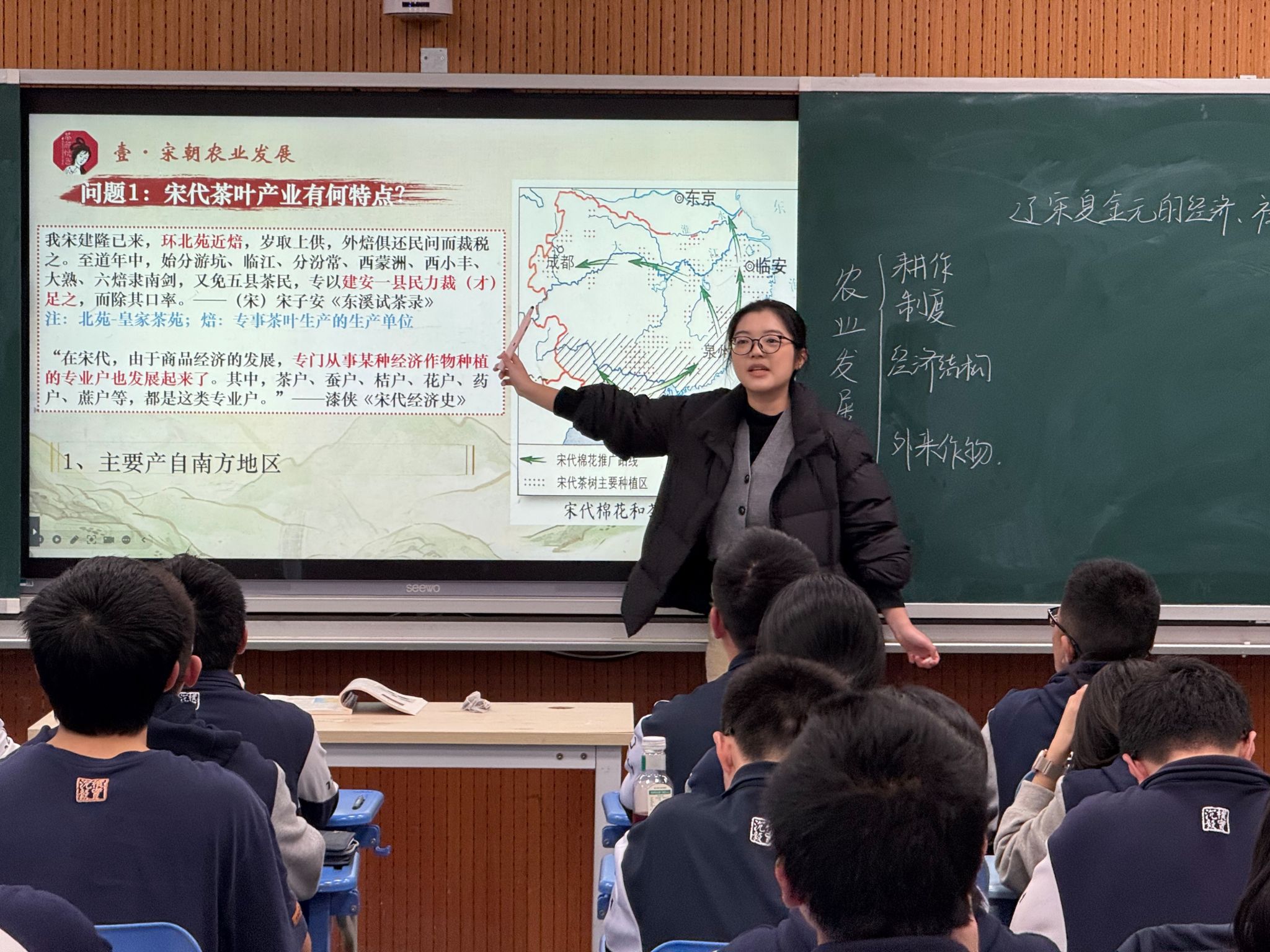 公开课由实习队员、金沙2004路线js52022级实习队总队长姚丁方执教,授课内容为《辽宋夏金元的经济与社会》,以“回到大宋开奶茶店”为情境线索,巧妙地串联起辽宋夏金元时期的经济、社会状况等知识脉络。指导老师充分肯定这堂公开课风格生动活泼,整体设计感强,史料丰富,讲授维度多元化,紧扣教学的重难点,师生互动紧密,充分展现了授课老师的素养。老师们也对教学有待优化之处进行了探讨。评课结束后,实习队队长陈琳琳汇报了实习队的工作成果。