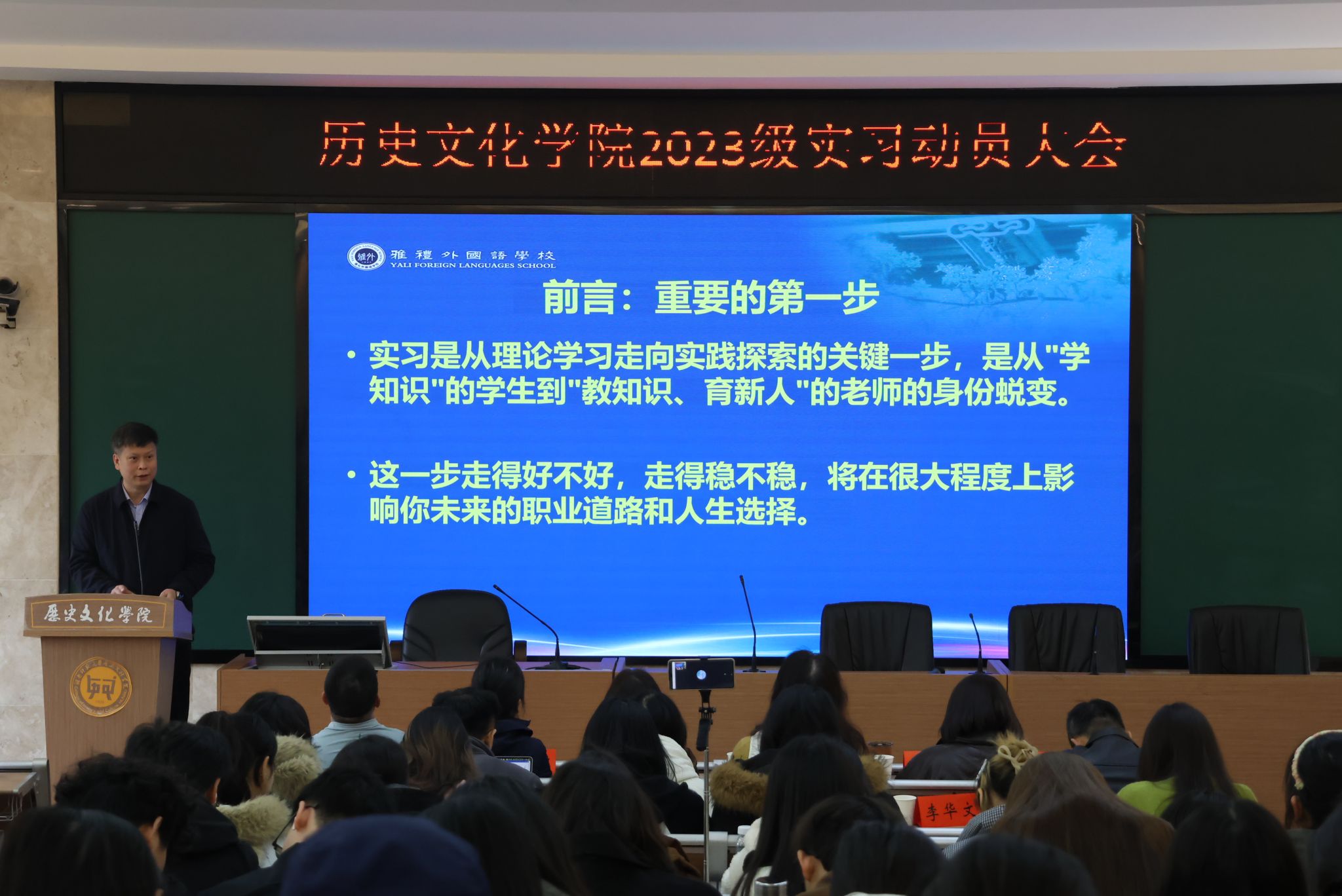 (通讯员 尹海旻)3月12日下午,雅礼外国语教务处主任苏剑杰于文渊楼203开展教育系列专项讲座,金沙2004路线js5党委副书记马欣,副院长傅新球,教务办主任代兴莉,实习主任成丽,全体指导老师和2023级全体学生参加。