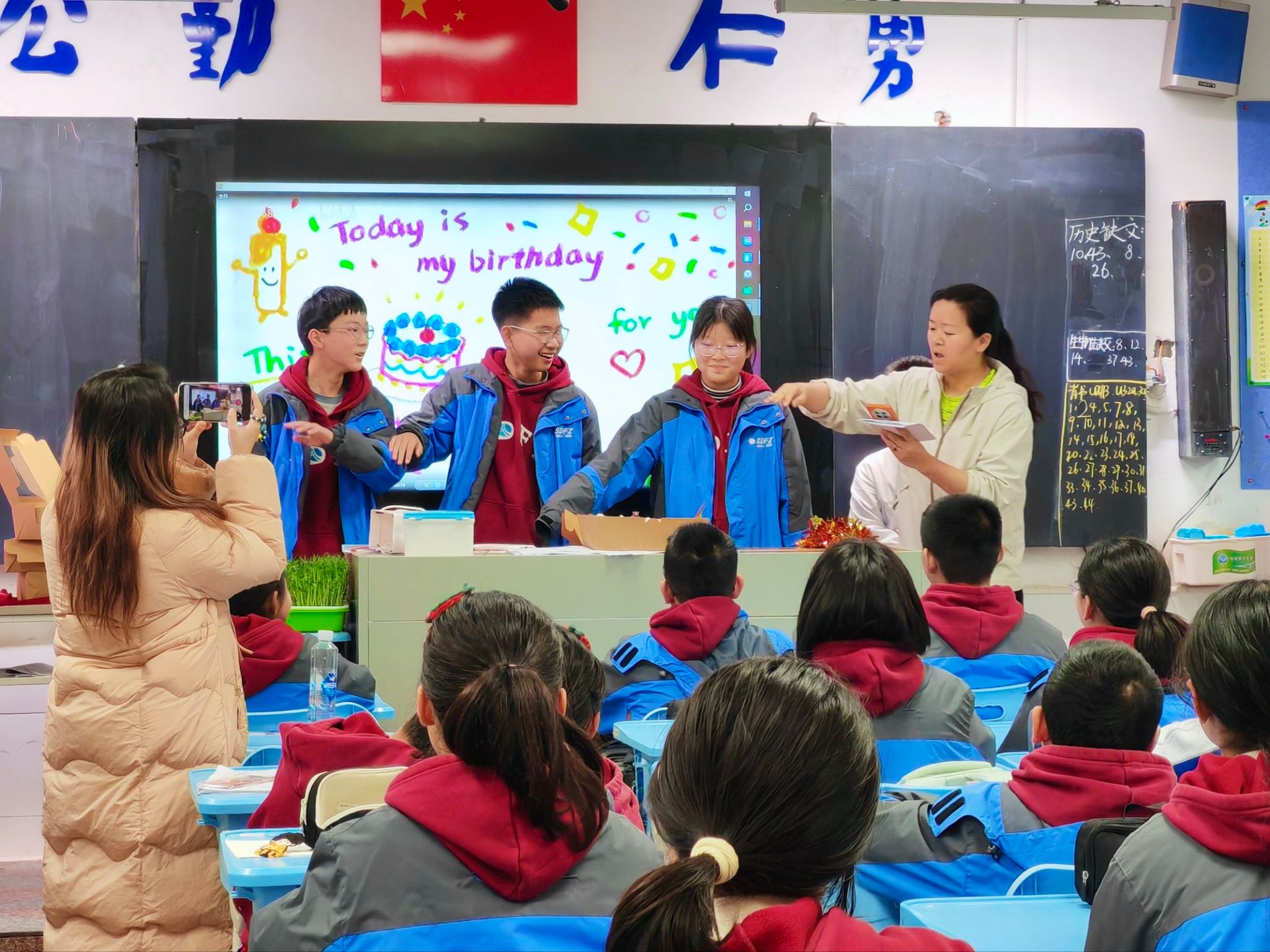 在校园活动与班级建设中,实习队员坚持多点发力、主动担当。在班级生日会中,全程协助指导教师完成场地布置、流程策划与氛围营造,以温情用心的组织提升学生归属感,有效增强班级凝聚力;在主题班会中,独立承担设计与实施工作,紧扣春季防传染病主题,以互动分享调动学生参与热情,在实践中系统锤炼了活动策划与课堂组织能力。