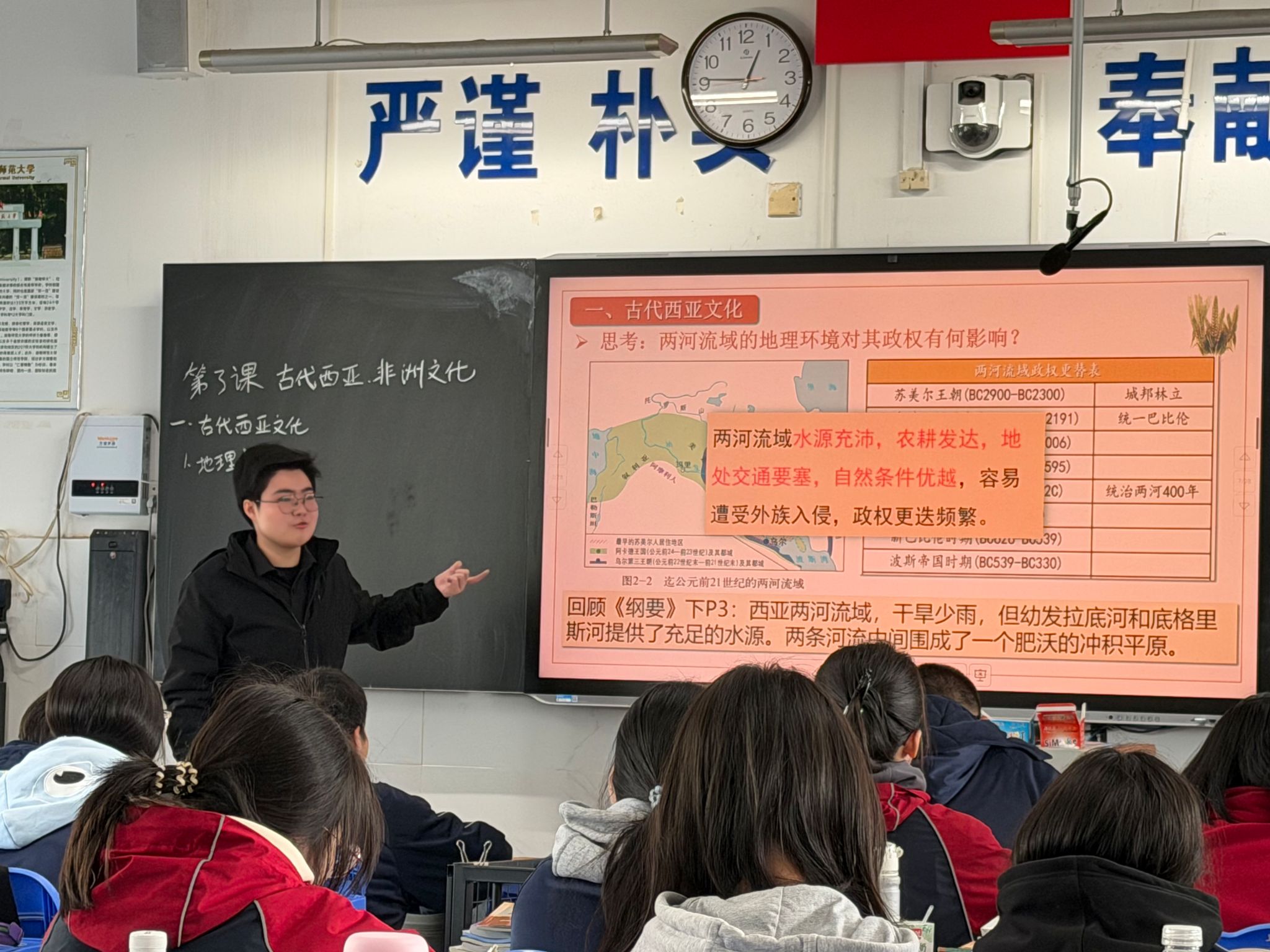(通讯员:李思怡涂礼勇)2026年3月27日,金沙2004路线js5赴望城一中实习队开展首次正式进班授课活动,实习教师何紫昕执教高中历史选择性必修三第3课《古代西亚、非洲文化》,课堂成效显著,获师生一致好评。