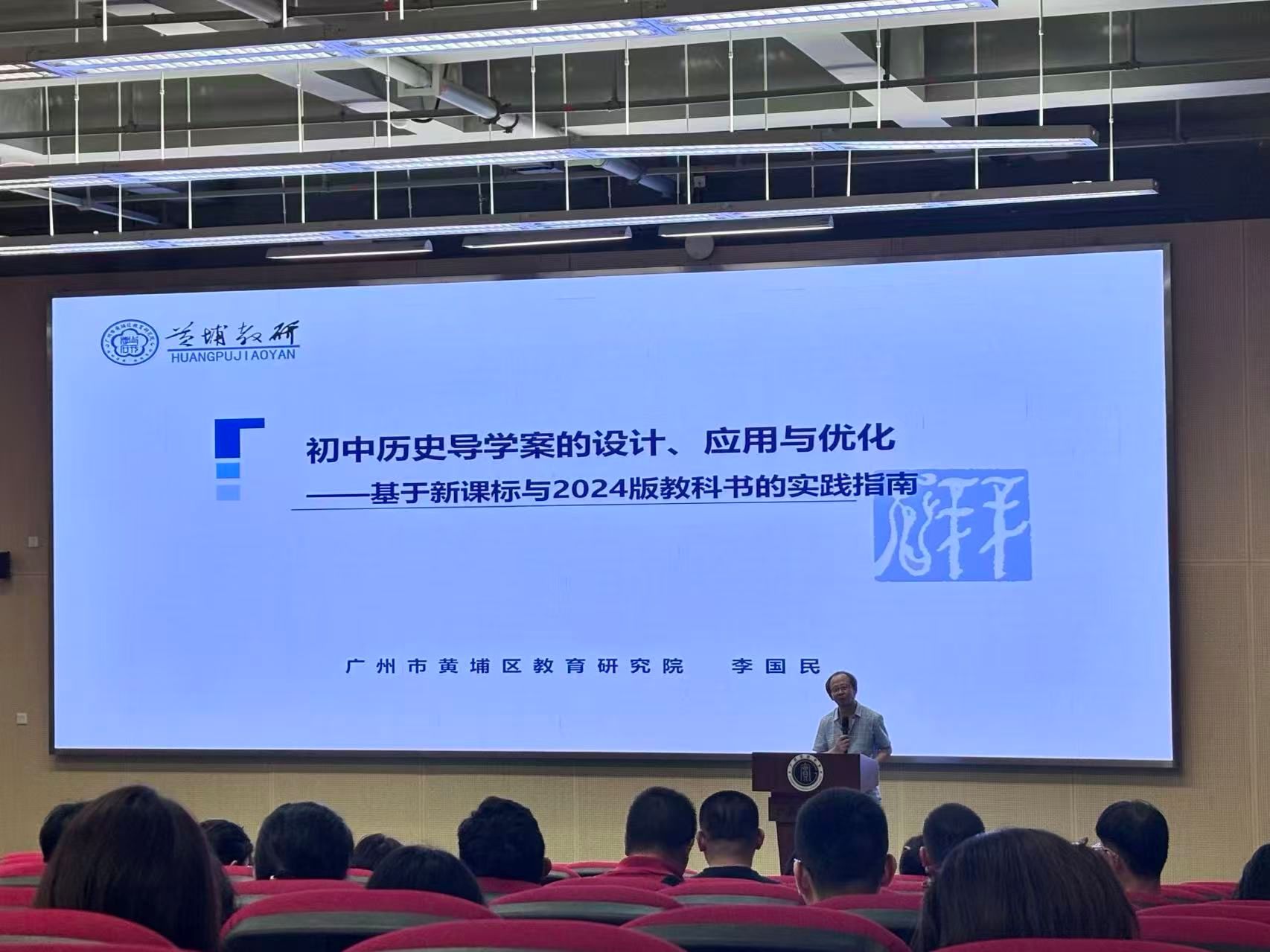 最后,广州市黄埔区教育研究院教研员李国民作《初中历史导学案的设计、应用与优化》专题讲座,结合2024版新教材与教学实践,系统讲解导学案的设计原则、使用策略与优化路径,为一线教学提供实用指导。