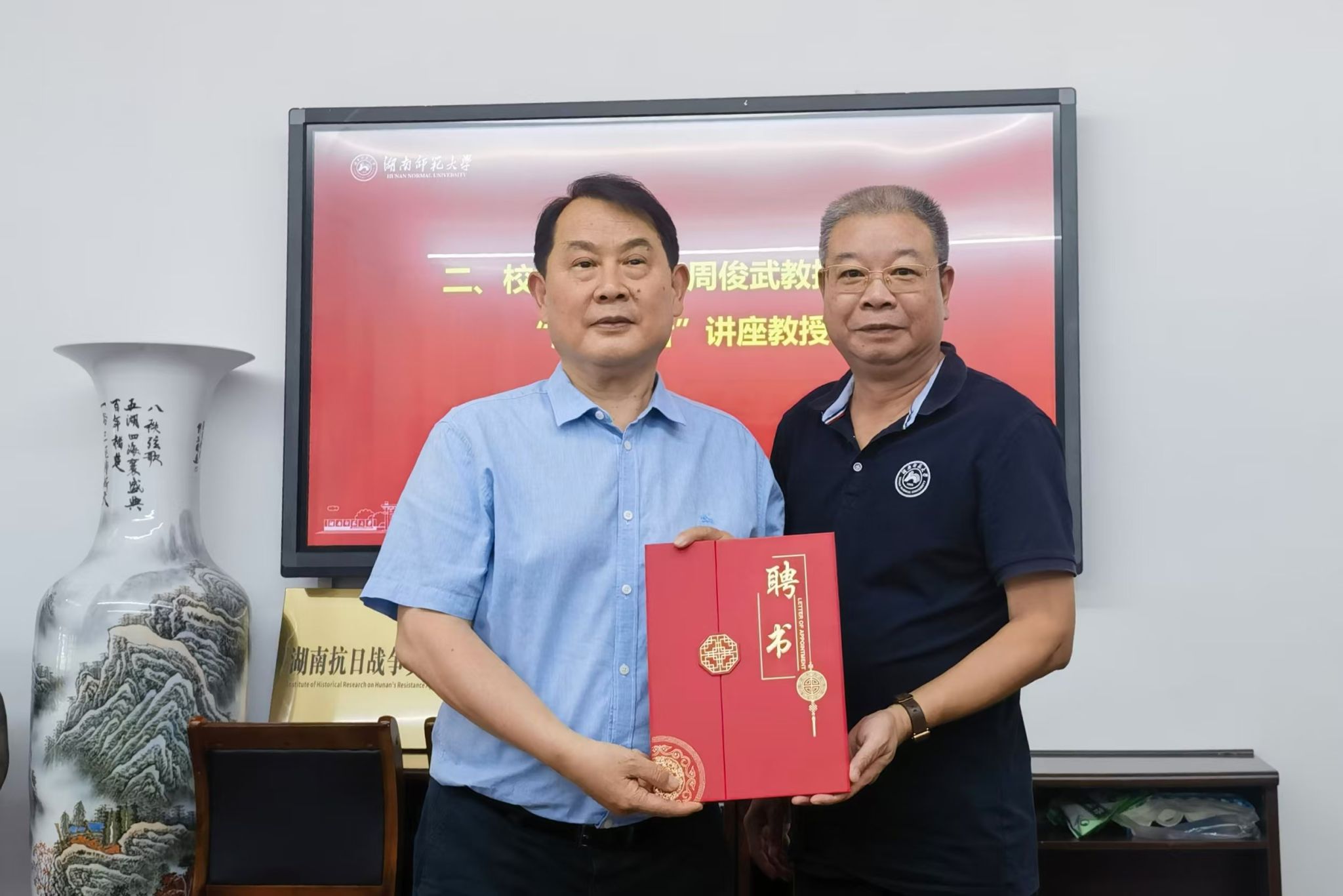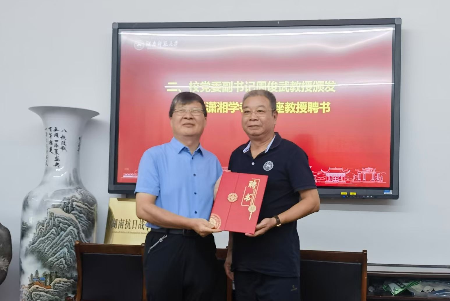 周俊武为陈谦平、李细珠依次颁发“潇湘学者”讲座教授聘书。