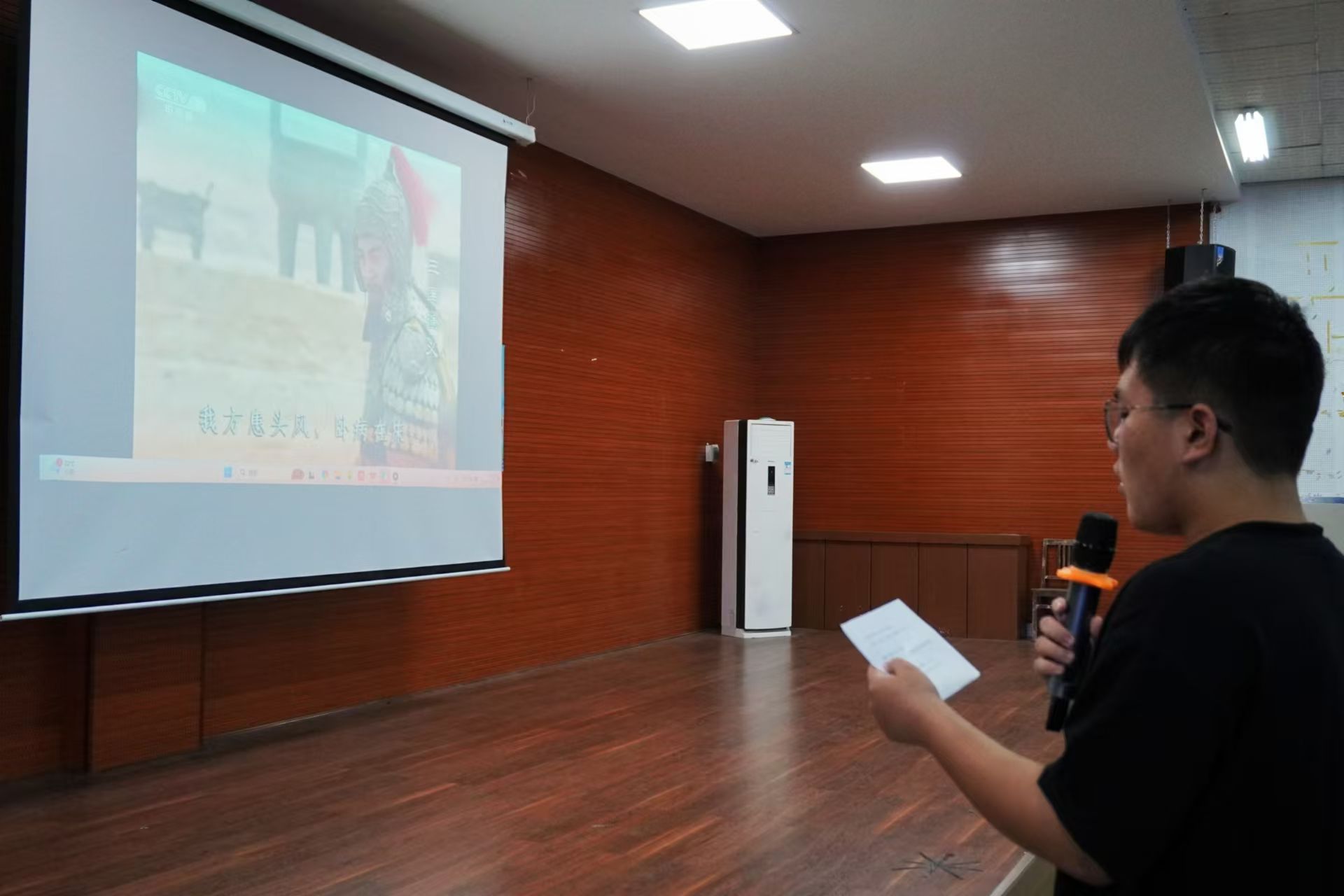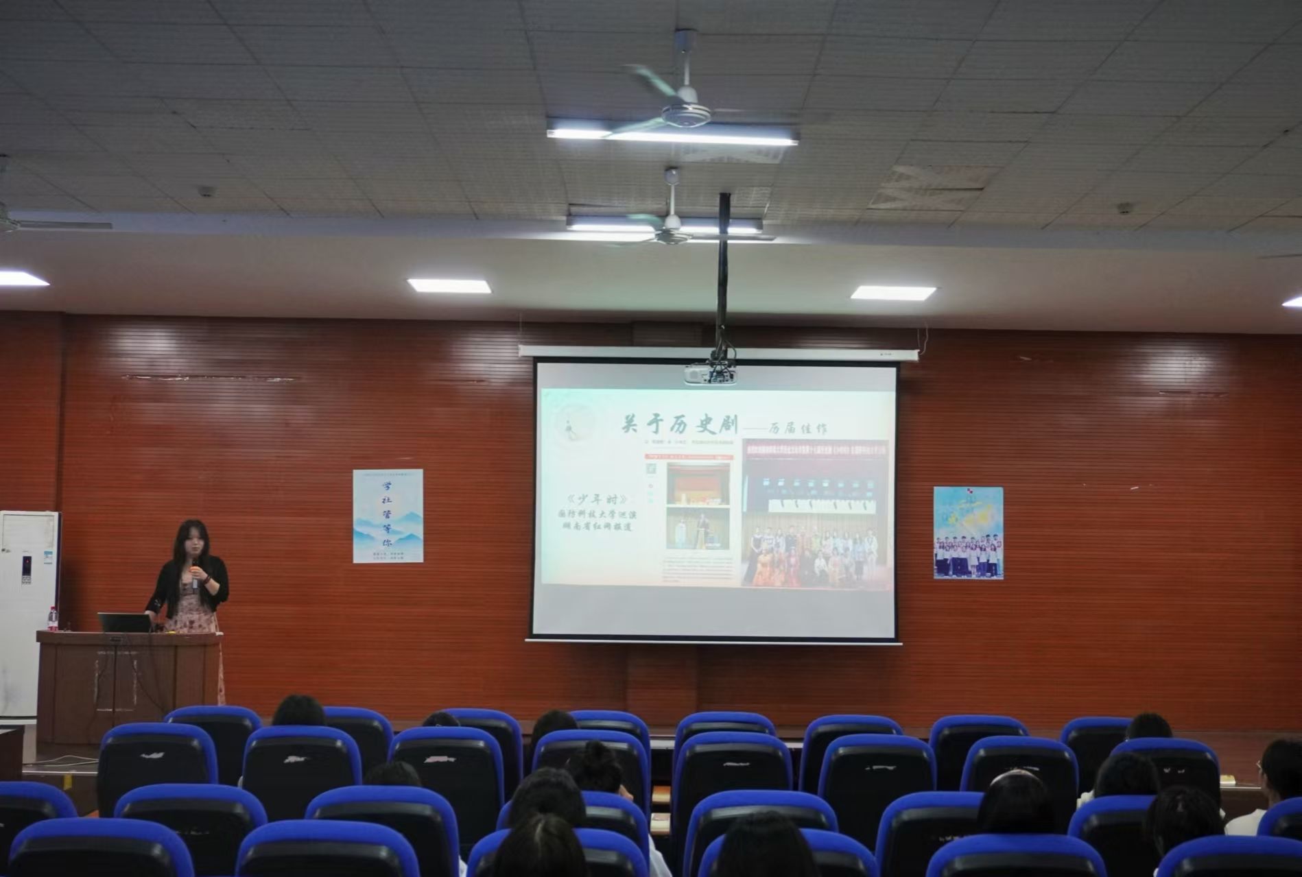 推介会主要分为历史剧基本情况介绍、互动以及提问三个环节。会议伊始,姜岸彤对同学们的到来表示感谢,并简要介绍了历史剧组的基本情况,阐述了历史剧组活动的多样性。她特别指出,今年将分类别进行导演、编剧、演员与剧务的招新工作。随后,她向同学们展示了二十年来历史剧组的展演剧目与所获奖项。互动环节,姜岸彤在播放多个电视剧及动漫片段后,邀请同学上台体验配音,提高了同学们的积极性与参与度。姜岸彤为同学们解答了有关历史剧的疑惑,并鼓励同学们踊跃报名加入历史剧组。