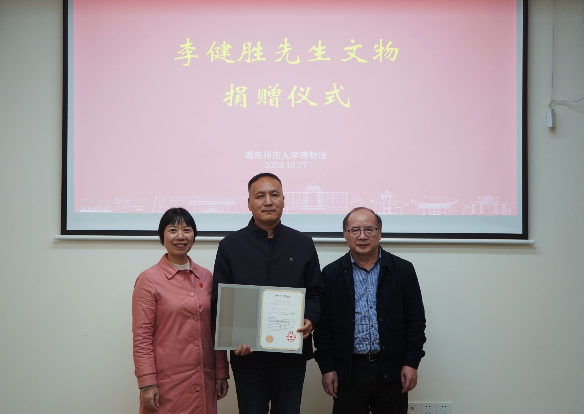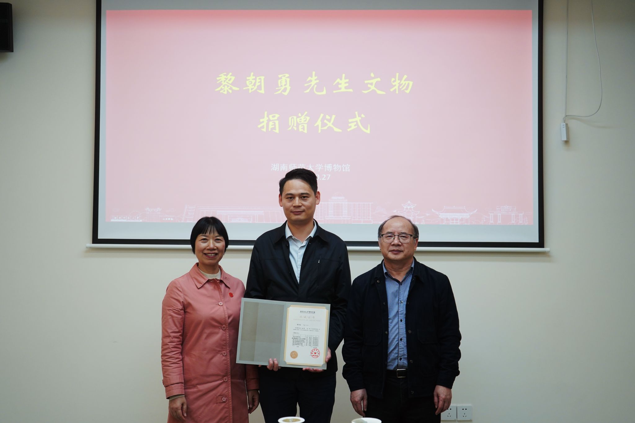 10月27日,时值我校建校86周年之际,校博物馆举行了黎朝勇、李健胜先生文物捐赠仪式。博物馆执行馆长李建毛,副馆长黎天宇、朱棒,广东好普集团董事长颜盛繁先生出席仪式,仪式由金沙2004路线js5党委书记孔春辉主持。